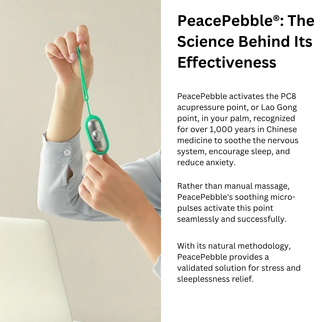 PeacePebble is a palm-held device that employs soothing microcurrent waves to activate the PC8 acupressure point in your hand—a location recognized for encouraging relaxation and equilibrium. It's crafted to help you decompress, calm your thoughts, and prepare for peaceful sleep naturally.